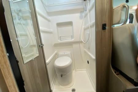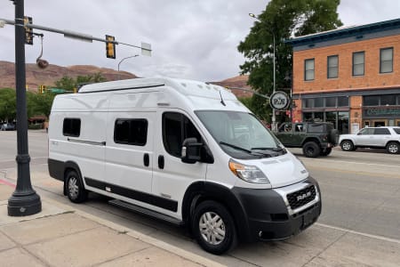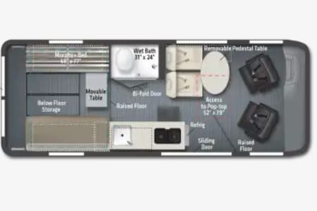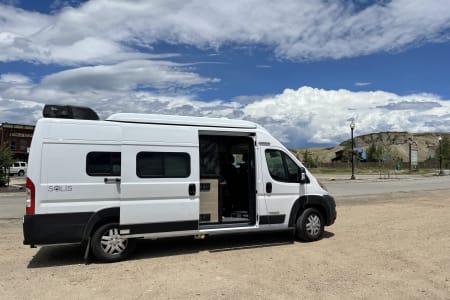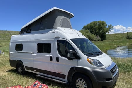 Van Halen is a 2023 Winnebago Solis 59PX, with a Pop-Top roof for 2 campers to sleep. The van is built on a 2022 Dodge ProMaster 3500 chassis with a fuel-efficient engine, all the new model upgrades including Apple Car Play, navigation and a large touchscreen. The front seats swivel around to create a cozy sitting area with a table. There is an indoor and outdoor shower, and indoor toilet. The toilet is a cassette, making for easy & safe disposal. The main bed can be folded up for additional storage area, or left down. This van is the 59PX version which offers another 18" storage area behind the bed which can keep two bike safe and clean. Quick connect water, 26 gallon fresh and gray tanks. Propane gas cooktop and furnace, water heater. A/C, Generator and solar powered batteries. Refrigerator, sink, kitchen pots & pans, plates, cutlery, games for everyone and everything else is ready and stocked for your adventure.