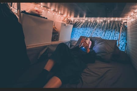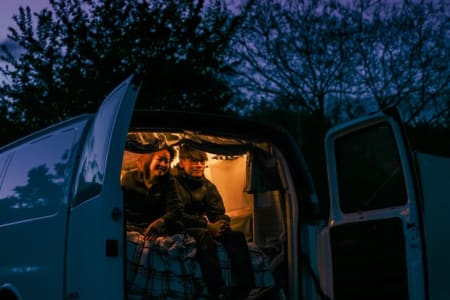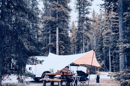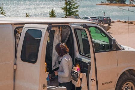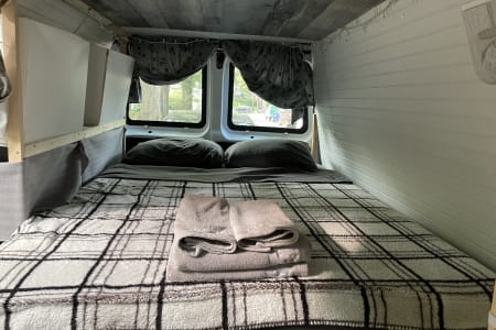 This camper van is clean, simple, and very comfortable. Unlike other camper vans where the bed is built sideways, it has a standard queen-size thick mattress, so you get excellent sleep here. If you prioritize a good sleep after all day adventure, this is the ideal van for you.