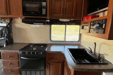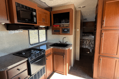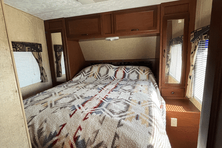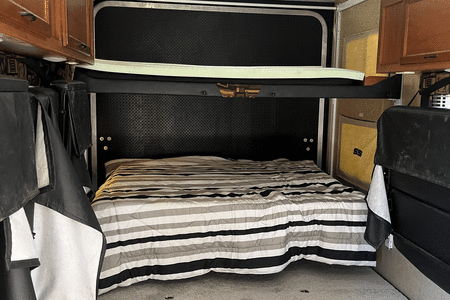 This thing is fully loaded with tons of features including:Dual rear electric queen bunks Bottom bunk folds into a couch 2 bench seats with table Couch with table folds into a bedQuiet Onan 5.5kw generator with 144 hour 20 Gallon Fuel StationFiberglass Exterior150 Gallons of fresh water capacityTV with DVD playerAM/FM/CD with inside and outside speakersWalk on roof with ladderBunk ladderFull kitchen with sink fridge oven and microwaveDual a/c unitsRear screen doorElectric awning just push a button for shade!Spare tire and carrierFront bedroom with walk around bed.