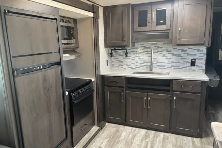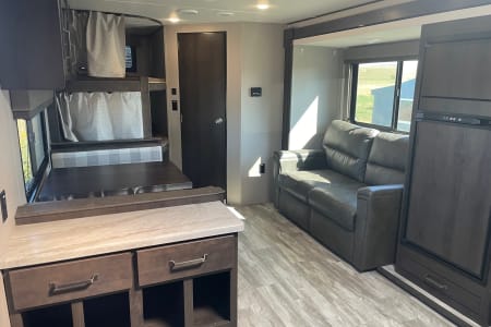 Perfect for first time and seasoned campers alike, a modern residential living space that is easy to call your home away from home. Easy to tow, fully loaded, it is around 7695 lbs. Sleeps up to 9. Camper will come stocked with some essentials such as, bedding, coffee pot, dish ware, pots and pans, and camping chairs. Book your vacation today!!!