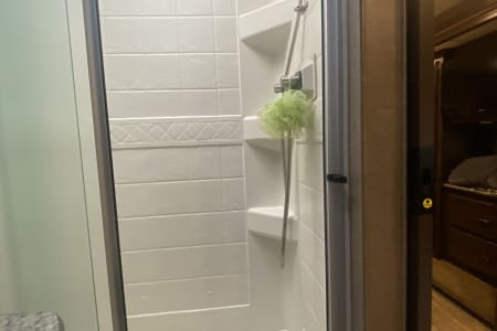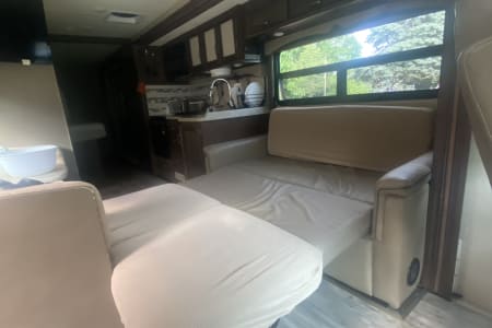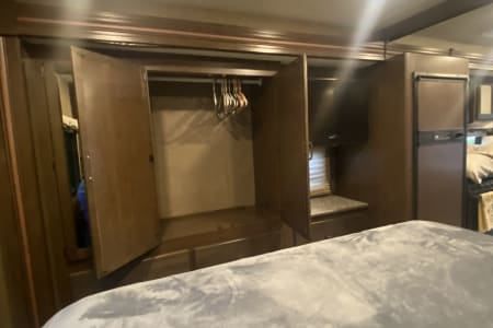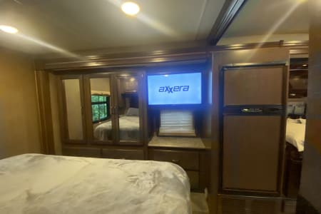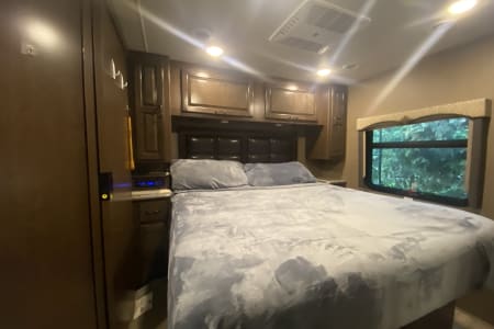 This RV has all the amenities of home with a private bedroom with king-sized, upgraded mattress, 6+ drawers and plenty of closet space. This area has its own TV, A/C and door for privacy. The bed could sleep up to 4 children depending on sizes.