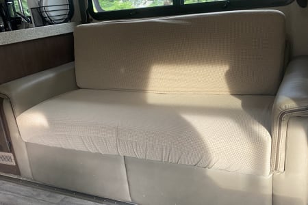 There is a full-size, drop-down bunk over the driver’s area, a dinette that converts to a bed that is larger than a twin bed but not quite full size and two new recliners. You can easily sleep 6 people depending on their size. We supply an array of fresh linens, blankets, pillows and towels as well as soaps and sanitizers.