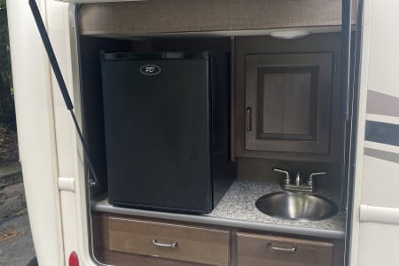 Outdoor dining is made easy with a second refrigerator, sink and many of the supplies you need to make your camping trip fun; table clothes, garbage cans, 5 folding chairs, a small cocktail table, 3 folding tables, a gas grill, grilling sticks, pudgy pie utensils, fire starters, etc.