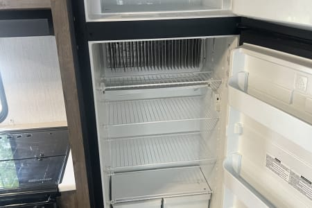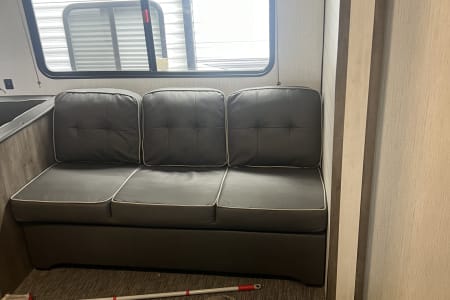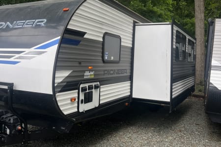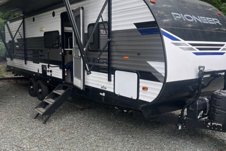 Heartland Pioneer QB300, Sleeps 8 comfortably but can sleep 10 if needed. It has good storage space, 32' smart tv, AM/FM radio, queen bed with upgraded mattress(medium firm memory foam), pull out couch full bed, twin size bunk beds, and the table turns into a full bed as well. It comes with outside shower, microwave, three burner cooktop and oven, double kitchen sink, ventilation, cold AC, hot heat, full bathroom.