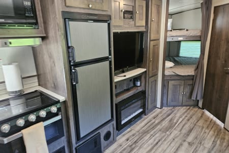 his Cruiser MPG bunkhouse is in fantastic condition and is perfect for families or friends looking for a home away from home. It sleeps 8 comfortably and includes a standard sized queen Tempur-Pedic mattress, two full-size bunk beds, a sleeper sofa, and convertible dinette.