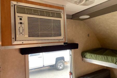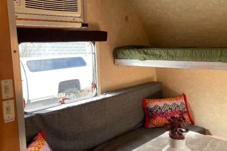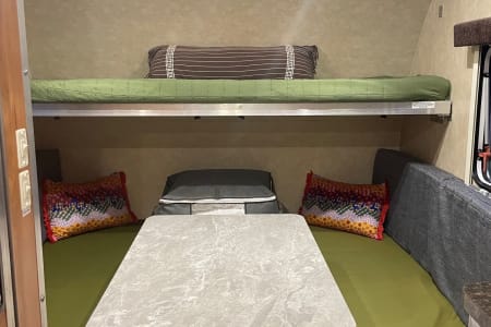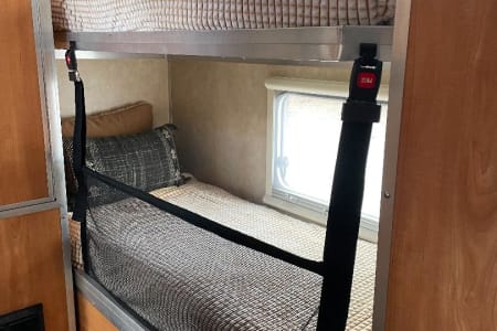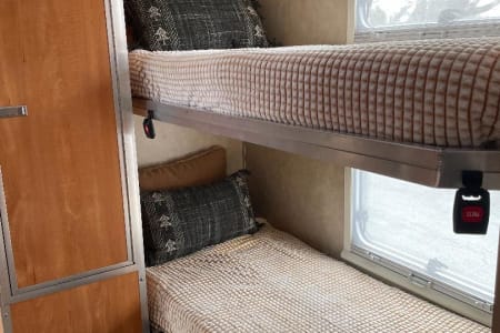 This camper comfortably sleeps 4 Two very sturdy twin bunks. The U shape dinette area folds out into a KING sized bed. The lower bunk offers a safety net for younger children. Windows are equipped with black out shades for sleeping in :)
