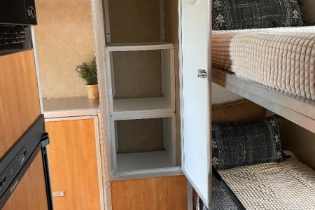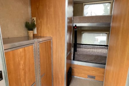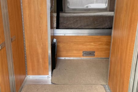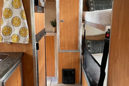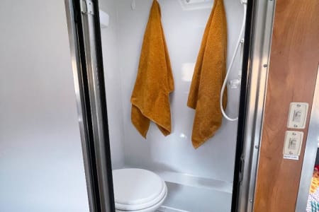 Wet bath with a standard size porcelain toilet. Great storage throughout including a small closet, many cabinets, and under bench storage. TV/DVD and radio.