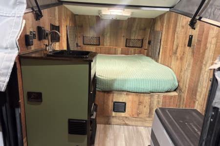 Want more than a tent but don't want a big rig to tow around? Big things come in small packages. We have the rig for you. You can stand up and change your clothes, has AC for those hot days and heat for the cool nights. Outside water connections for washing dishes and showering for off-grid camping. Generator is available for $100 per trip. It is time to explore nature and go to places big rigs can only dream of going. Grab your hiking boots and telescope and you are ready to explore the great outdoors. It comes equipped with a cooler/refrigerator, cooking utensils, pots and pans, plates and a basic set of spices. When you are set up it has a 10x10 canopy and chairs for enjoying the fresh air. Loaded this camper weighs less than 2000 lbs. and can be towed by just about anything. The camper comes equipped with trailer brakes and uses a 7-pin wiring harness for the brakes or an adapter if you don't need the trailer brakes. We have towed it in Texas, New Mexico, Colorado and Arkansas with a 2 door Jeep Wrangler with no problem.
