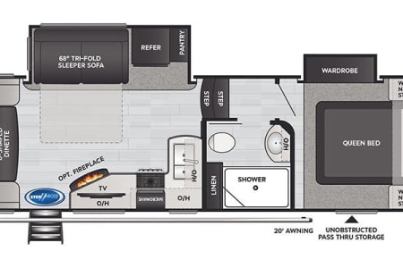 This brand new Keystone Cougar fifth wheels is perfect for your upcoming camping trip. This camper is best suited for camping with or without any hookups. Without hookups means if you are staying at a state park, this is the perfect camper because of the large fresh water tank and solar panels. With 60 gallons of water you can last a long time! The solar panels will also keep everything all charged up for you and if you still need more power for running the A/C on those hot summer days, there is an available generator as well.