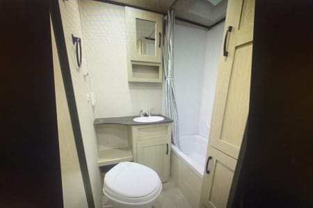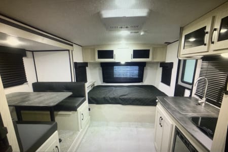 The travel trailer sleeps 5 comfortably. Has most everything you need to make yourself at home. Kitchen is stocked with utensils, plates, cups, etc.