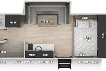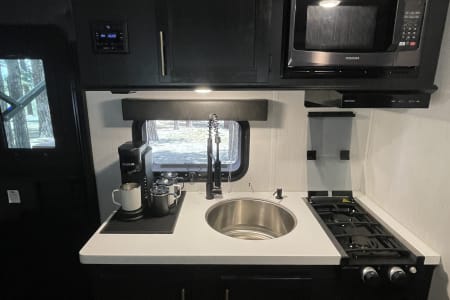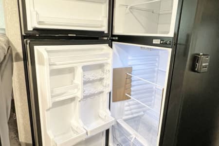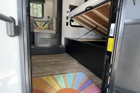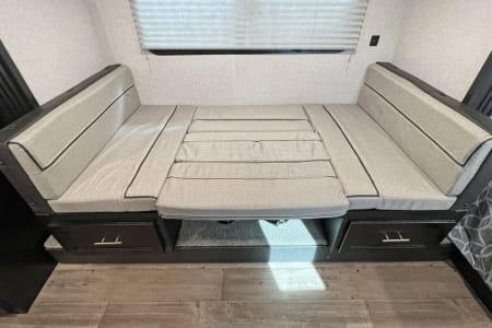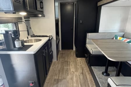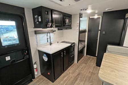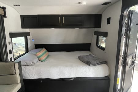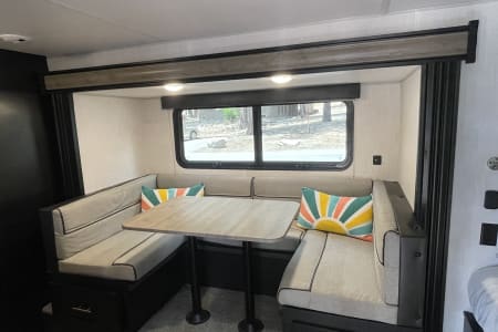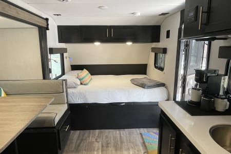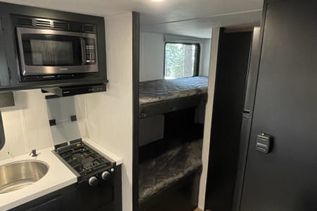 Our trailer is well-maintained, clean, and fully equipped with everything you need for a comfortable and enjoyable trip. Inside, you'll find a cozy living area with comfortable seating and plenty of space to relax. Equipped with 3 different sleeping areas, a queen-sized bed, a dinette conversion perfect for one adult or two smaller children and bunk beds. The kitchen is fully equipped with a refrigerator, stove, and a microwave. The bathroom includes a toilet, shower, and sink for your convenience. There is also an air conditioner, and a heater for those colder fall/winter adventures and LOTS of extra USB charging stations.