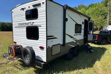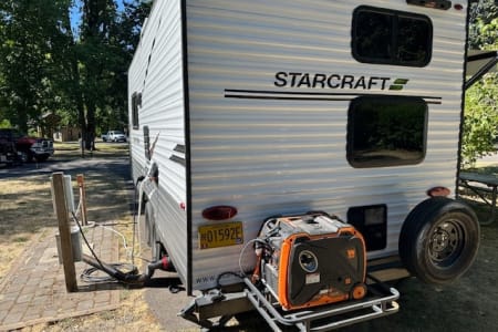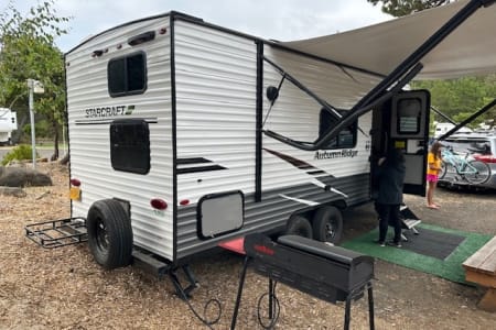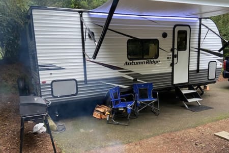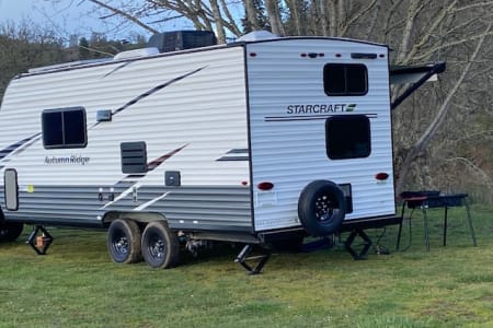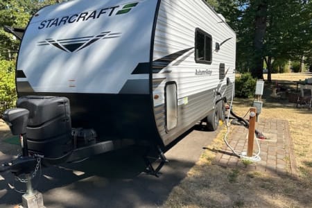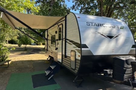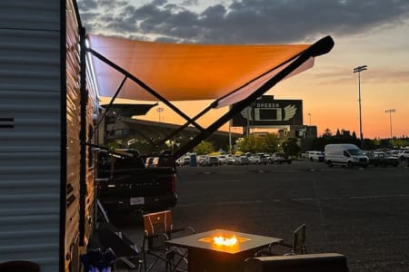 Your kids would love the double bunks. Both bunks have power outlets, lights, and USB outlets. Dinette is convertible to double bed. Queen size Murphy bed offers a couch by day and larger bed at night. The fully stocked kitchen has a fridge freezer, 3 burner stove, microwave and oven. The kitchen also includes cookware, dishes, silverware, paper good, and coffee maker. The trailer also has a smart TV and BT stereo. You will stay comfy no matter the weather. The furnace runs on propane. It has air conditioning as well.