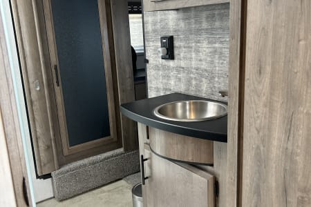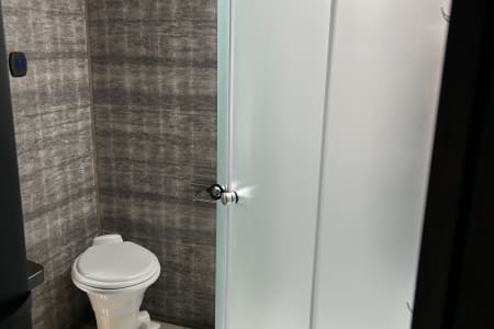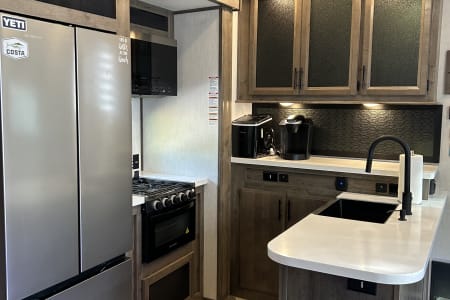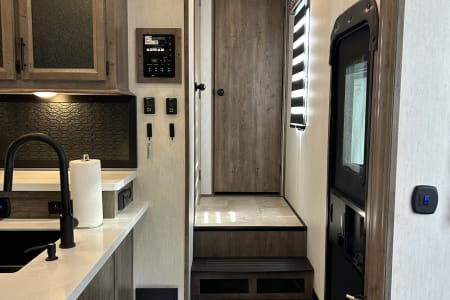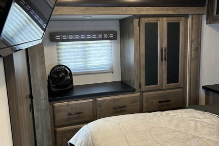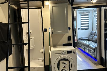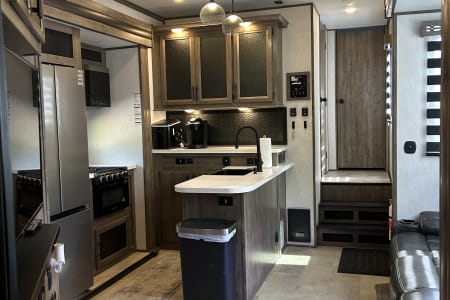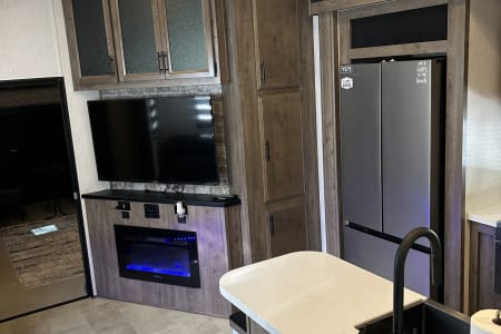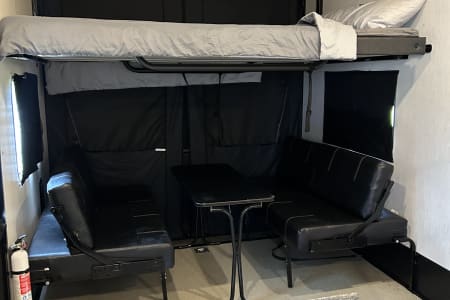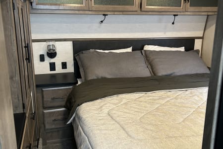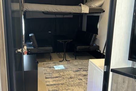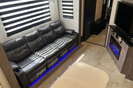 Spacious floor plan with a master king bed in the front with full bathroom , stand up shower . Bunk beds in the rear with a convertible couch for additional seating and bed, also 2 additional queen beds and bathroom in the back. 2 LED power adjustable awnings, 2 a/c units, fireplace, large TV in living room and also TV in the master bedroom- Firestick on both TVs. Bluetooth stereo with speakers inside and out. All linens, Including towels, sheets, blankets and pillows included.