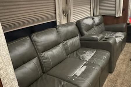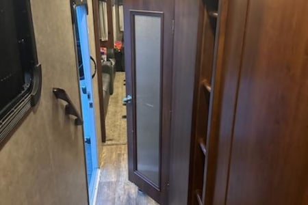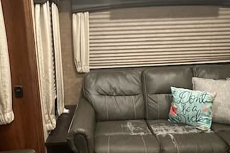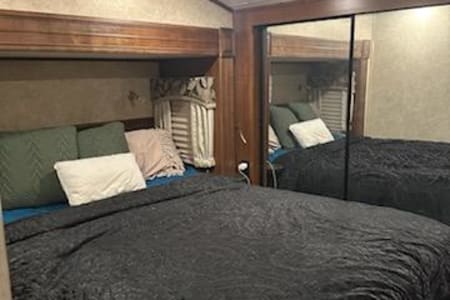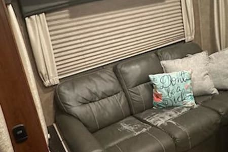 Perfect camper for large families with small or bigger children. Middle bunk room with bunk beds with a loft as well. Residential fridge big enough for all the goodies you might need to store with a water dispenser and a ice maker two pull out couches and movie theater seats that recline. Large walk in shower.