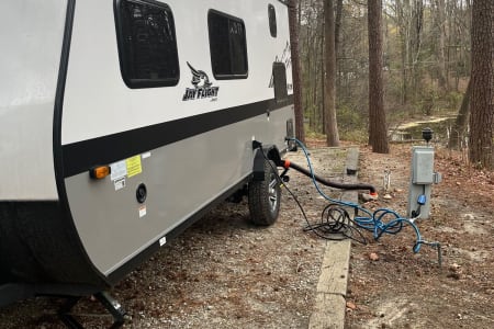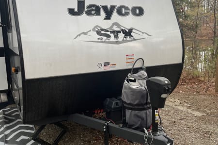 This tow behind trailer, features anti-sway bars, an electric tongue jack, and leveling jacks to easily set up. It has a city water connection, fresh water tank, electric connection, and can be generator powered if needed.