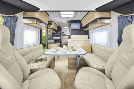 cabine de conduite fondue avec l’espace de vie. Choisissez l’Intégral Premium pour la route et les longs périples. Osez les voyages avec cet élégant et spacieux camping-car, donnez vie à vos envies