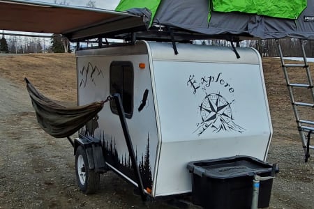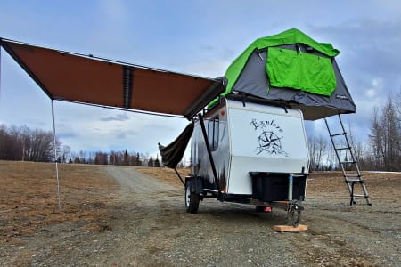 The camper boasts many extras: it has an integrated hammock stand, rooftop tent (available for add on) Additionally, it has a 10' awning on the side for those rainy days, cozy LED lighting inside and out, as well as a USB plug-ins in the sleep compartment to charge your phone or power another USB device.