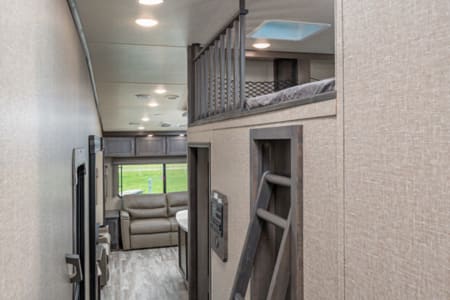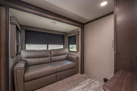 This palatial 5th Wheel is the newest addition to our fleet and the largest RV we've ever offered. It sleeps 8-10 people between a king-sized bedroom--equipped with a smart TV--and a second bedroom with a fold-out couch, desk, smart TV, and queen-sized bed with a loft above. It comes with two refrigerators, one inside and one out, and the living room and kitchen combine to offer a truly spacious living area that'll feel just as roomy and just as comfortable as the one at home: two couches, one of which is a fold-out, and another with heated and massage seat facing a full, beautiful fireplace and, of course, another smart TV to complete the package.