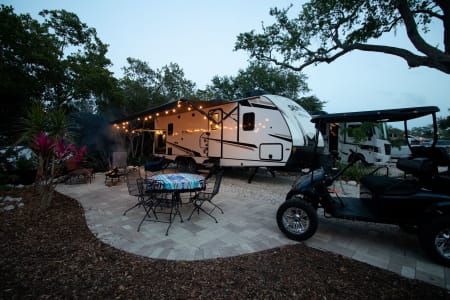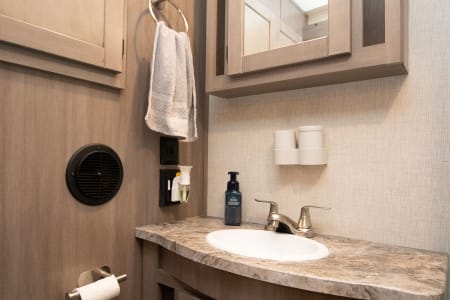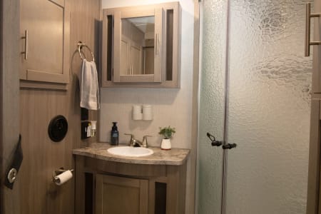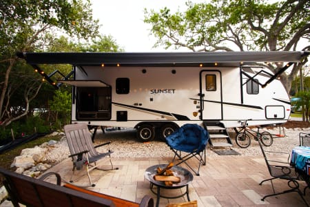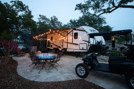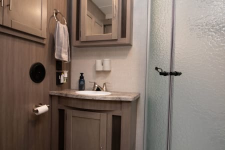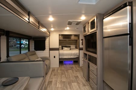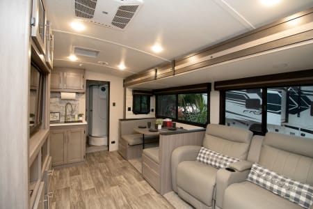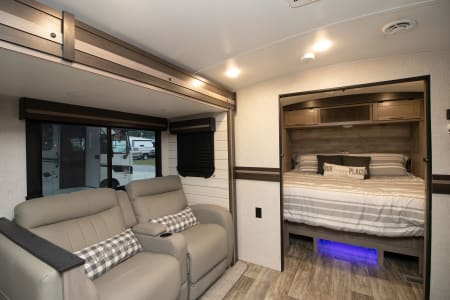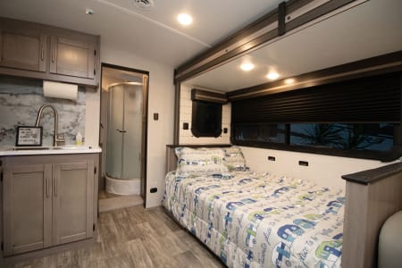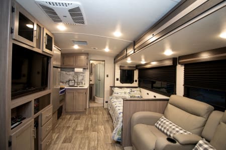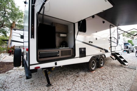 This unit has 2 AC's for the hot summer days, One big slide out, 2 TV's, And a big outdoor kitchen with second fridge, propane grill and sink! Power awning, LED lights, outdoor shower, and on and on it goes. The best part of renting from us is everything in the trailer is include