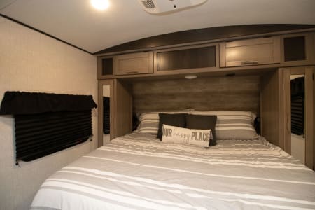 The front room has a King bed for mom and dad and the dinette table folds down to provide a LX Full bed for the kids.