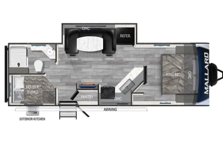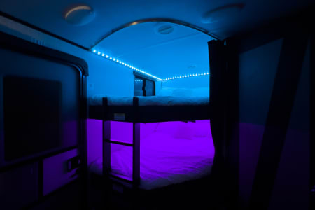 - Sleeps 8: 1 King bed with memory foam topper, 2 full size bunks, 1 full size Dinette conversion
