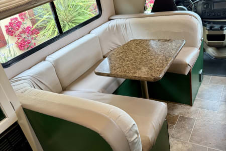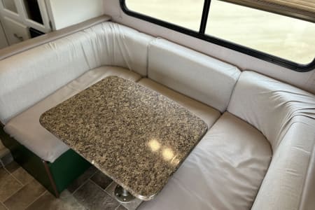 Gaze out the large window above the convertible U Shaped dinette, as you sit and enjoy your morning cup of coffee. The dinette has seatbelts, cupholders, and LED lighting and converts to a sleeping space. Extra storage above and storage drawer below. Vinyl flooring throughout the interior for easy cleanup. Above the dinette, a roof-mounted air-conditioner with temperature controls keeps you cool during the summer months.