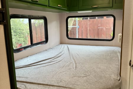 Sleeps 5 adults comfortably, two adults in the queen bed, two in the over-cab bunk, and one in the 48” x 68” convertible dinette bed. In the bedroom area, you’ll find a queen bed (54” x 80” ). Two windows in the bedroom for dramatic views, storage above and LED lighting throughout, vent, and privacy curtain. The upper cab bunk can sleep two adults (54” x 96” 500 lb. capacity) and a removable ladder. Also, in the bedroom, there is an easy-to-use wall-mounted thermostat for the direct vent heater. Mirrored storage closet with drawer below and a hanging rack to hang your clothes.