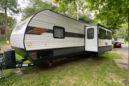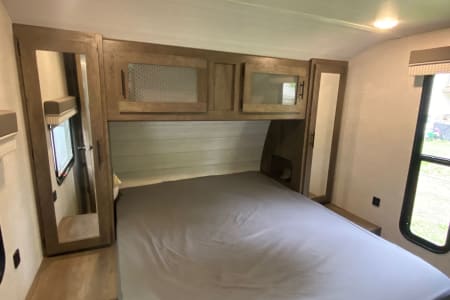 Great size camper for friends and family. Big fridge, stove, microwave inside with mini fridge outdoor griddle outside. Outside Sound System. LED Lights. Electric fireplace when it gets cold. Master bedroom has a queen bed with plenty of storage, bunk house has two bunk beds with a pull out cough for another queen bed. Kitchenette and living room house and also convert into bedding! Comes with all accessories for hook up. Brand new 2nd AC unit installed in 2022. Plenty of space for people to sleep.