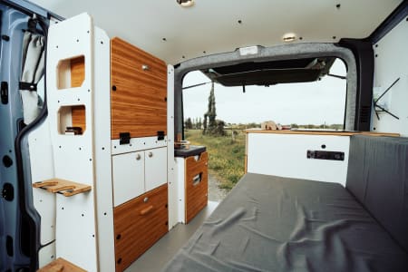 Le van aménagé Otago est idéal pour un premier voyage itinérant en fourgon équipé. Ce campervan est doté de l'aménagement North West. Le grand plus de cet aménagement dans ce van, est sa cuisine logée dans le coffre. Ainsi, peu importe la météo, cuisiner dedans ou dehors est possible et dans tous les cas, face à une vue tous les jours différentes. Votre riz n'aura jamais la même saveur ! Ses accessoires comme le frigo, l'évier, la couchette ou encore le chauffage stationnaire ainsi que son lit spacieux de 130 x 190 en font un véritable nid douillet roulant.