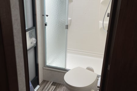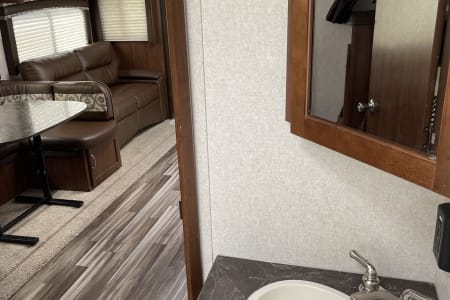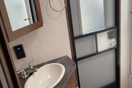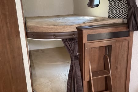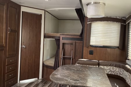 Large washroom with separate outdoor entrance, spacious bunks, roomy kitchen and lots of cabinetry for storage etc.