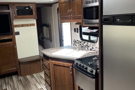 Book your family adventure and camp in comfort with this “like new” Jayco palace. Truly “glamping” in style with all the comforts such as an entertainment centre featuring cd/dvd, radio with indoor / outdoor speakers, flat screen tv swivels out for perfect viewing from the comfortable sofa and dinette. The tv also spins around to the master bedroom for tv watching in bed.