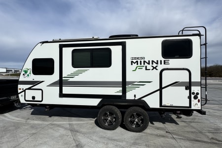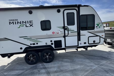 Rare, off the grid travel trailer. The Micro Winnie FLX 2100BH is capable of staying off the grid via its 2 190w solar panels, a 3000 watt inverter that powers all appliances and 110v outlets, tankless water heater, lifted with goodyear duratrac all terrain tires and much more.