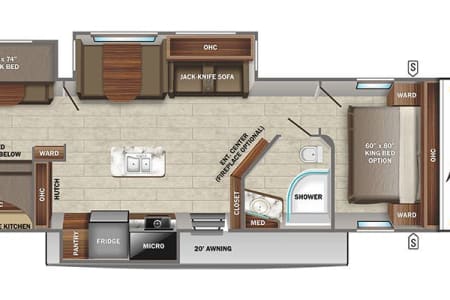Head out on excellent adventures with this Jay Flight travel trailer! This model comes with a great bunkhouse that has a slide out, a dinette, an entertainment center, and storage below one of the bunks. The front private bedroom has a queen-size Serta mattress for your comfort, and there are also wardrobes on either side of the bed for your clothes. Everyone can get cleaned up in the morning by using the radius shower in the full bathroom, and the skylight will keep this space bright and cheerful. While you are outside working at the outdoor kitchen, you will especially appreciate the 20' power awning because it will provide you with shade from the sun.