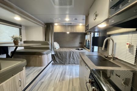 Going off the Grid? The Minnie comes with an integrated 200-watt solar panel with charge controller which will keep the 12V on-board battery charged, allowing you to utilize a lot of the key amenities, lights, stereo, and 12V USB ports located throughout. On those colder nights, you'll have both a gas furnace and water heater.