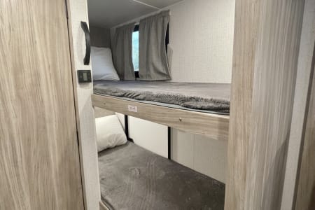 The Minnie features sleeping arrangements for 6, including a full-sized bed with privacy screen, slide-out with convertible dinette, and a set of cozy bunk beds perfect for young travelers.