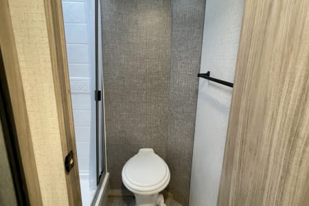 - The bathroom has both a toilet and shower. There is also an exterior shower head located on the rear of the camper. The Minnie is equipped with a 31 Gallon Fresh Water tank with gravity-fill, and an in-line water heating system.