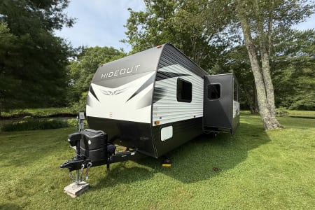 For any trip, whether near or far, you will want a Hideout fifth wheel, travel trailer, or toy hauler by Keystone RV. These models are lightweight which makes them easy to hook up and tow. Just load up your belongings and head out for a weekend away in your own Hideout retreat. A few key features inside of each model include: pleated shades in the living area, a high-rise faucet in the kitchen, and full-strutted storage under the master bed, and the exterior is just as indulgent with its powder-coated I-beam frame, exterior speakers, black radius window frames, hurricane straps reinforced structure, and the lighted adjustable power awning. Don't wait any longer to enjoy your own private hideout with the Keystone Hideout!