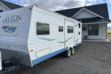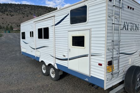 Unique trailer that will accommodate the whole family, Has bunk beds in the back, dinette that makes into a bed, couch that folds down in seconds and a front private queen. Dinette slides out for tons of room. Has 3 burner stove, microwave, fridge-freezer combo. 30 Amp plug in for shore power. Spacious shower and porcelain toilet. This trailer weighs 5920lbs dry and can be towed safely with a 1/2 ton truck. Hitch and load levelers are available to use if needed. Come start your adventure today