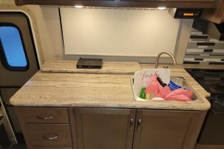 4 camping chairs, large 9X12 RV outside mat, 5-ft folding table, 30/50amp or 50/30amp adapter, 6 leveling blocks, 20-ft sewer hose, 25-ft water hose with a water pressure regulator and 90 degree elbow, 2 rolls of RV toilet paper, trash can, broom, and a Keurig style coffee maker.