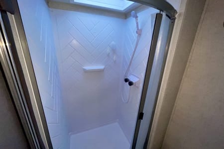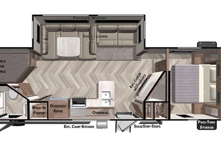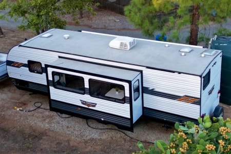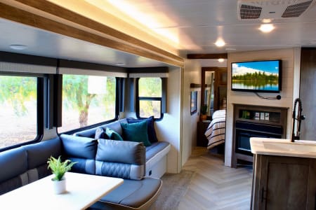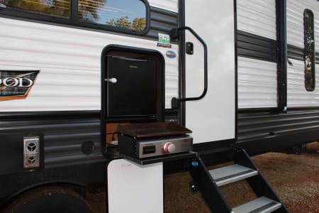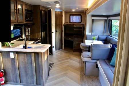 Our affordable travel trailer is a favorite among families who wish to camp in style with plenty of extra room in our full size double bunkhouse. This trailer is 33 feet long and sleeps 8-10 people. One of our favorite features is the large slide out with a dinette and the Versa Lounge couch. This trailer comes with a smart TV, and entertainment center above the fireplace. There is plenty of counter space in the full kitchen. We love the large floor to ceiling pantry and all the storage available. This trailer comes fully stocked with cooking utensils, pots, pans, coffee maker, rv toilet paper, cleaning supplies, propane, and a water hose. This trailer comes equipped with an outdoor camping kitchen which includes a mini fridge, bbq griddle and outdoor shower. Customers choose Ready 2 Roll RV rentals for the comfort and convenience. We deliver, set up and offer dump services for a flat additional charge.