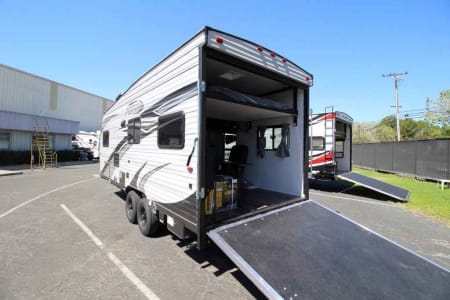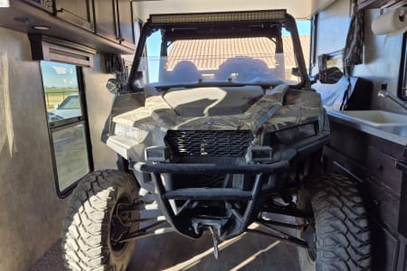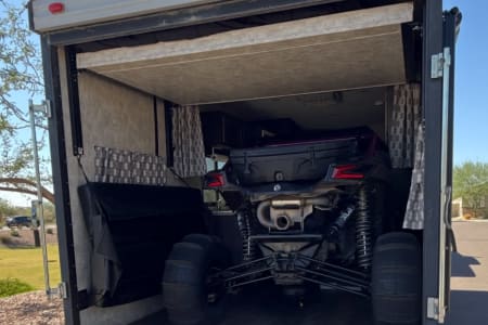 Great toy hauler towable by a 1/4 ton vehicle with trailer brakes. Fits most 2 seater Rzr/Canam SxS (will fit some 4 seater SxS) or several quads or dirt bikes or whatever toys you might have.