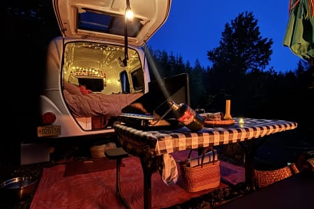 My sweet little 1300 lb 2022 Happier Camper HC1 is perfectly set up for you to just pull away with your car. I tow it with a 2WD Ford C-Max! I am also happy to deliver it to you up to 10 miles away from my residence in Portland, for an additional small fee.