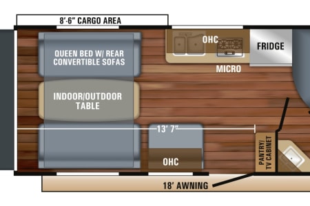 This is a great little toy hauler that is big enough to fit in a quad or side by side and yet still be light enough to tow with a 1/2 ton truck. It's perfect for a family get away even if you don't have toys to haul as the back ramp door turns into a porch with screen making the 26 feet long trailer feel even more roomy. There's a queen bed for mom and dad and then one queen size bunk and one queen size dinette conversion for up to 4 kids or 2 more adults. GVWR 8000 lbs.