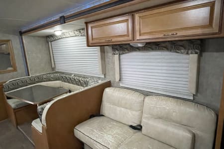 This Super Duty RV is the vehicle you've been searching for. It offers a smooth and comfortable drive, ample storage for all your gear, and a spacious interior to accommodate your activities. Inside, you'll find a fully equipped shower, kitchen, fridge, and bathroom, as well as a convertible couch and table setup for sleeping, generous overhead storage, and a queen-sized bed for a restful night's sleep. Secure your rental today, and you'll be ready to embark on your adventure in no time!