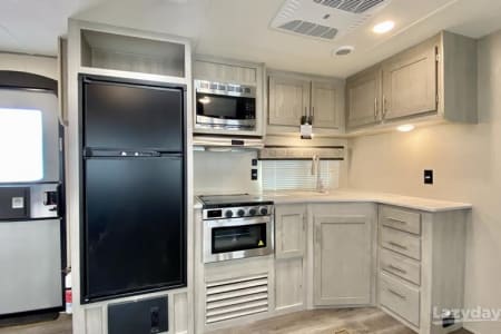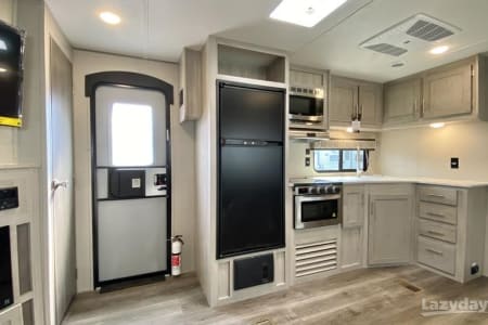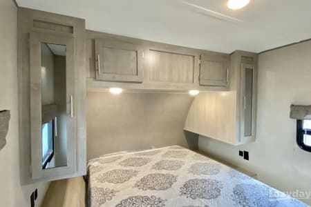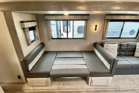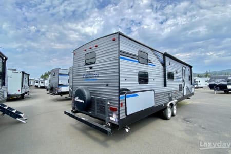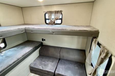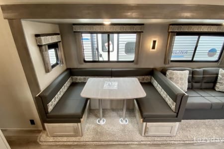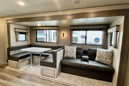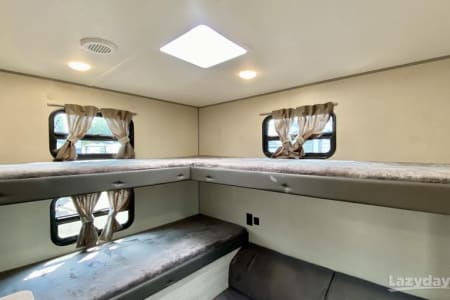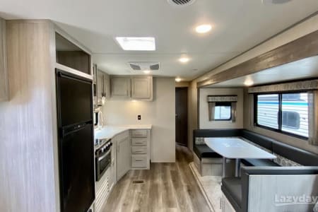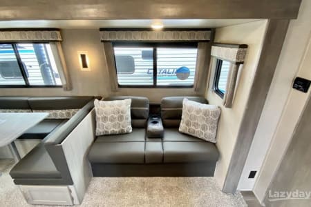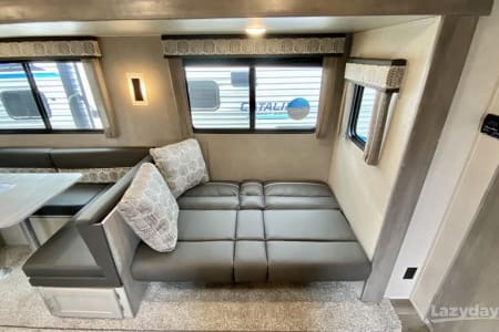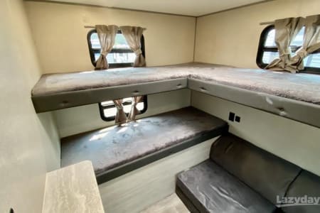 2022 Coachmen Catalina Legacy Edition 303QBCK Offering 2 bedrooms including a rear bunkroom with sleeping for 4-5 and a front queen room. Additional sleeping in the living area with a dinette booth and jiffy sofa. The corner kitchen will give more counter space than normal and with a corner entertainment you can comfortably watch from anywhere! The large pantry with shelves will allow you to stock up on everything so whether your seasonal or traveling. This is a great layout.