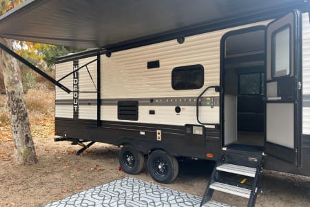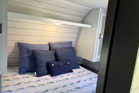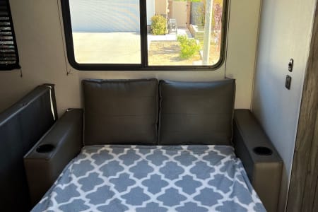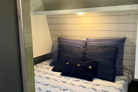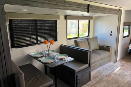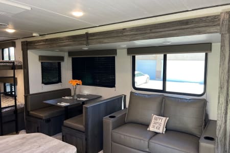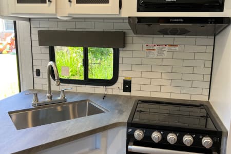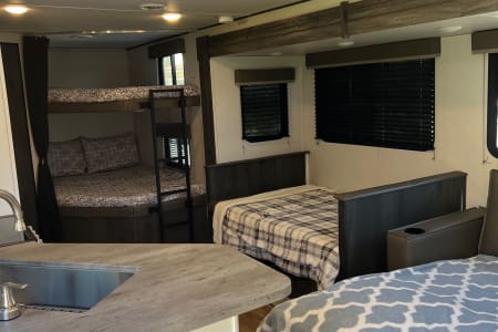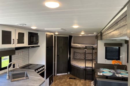Speakers inside and out, oversized bunks, 2 additional beds, and a closed off Master suite with a extra comfy queen size bed. There are usb ports and or outlets next to all bedsides and throughout the trailer. Bathroom has a small bath tub, perfect for infants and toddlers. Good size fridge and freezer, and a 3 burner stove, microwave, and oven. Dining for four inside as well as a love seat. There is a 40 inch TV, and Dvd player, bring your DVD's or plug in of choice! We try to keep the trailer stocked with most things you will need to cook both indoor and outdoor. The trailer also has outlets, so if you wanna bring your air fryer or something else to cook with you can!