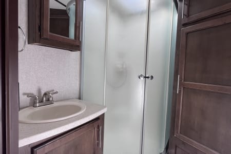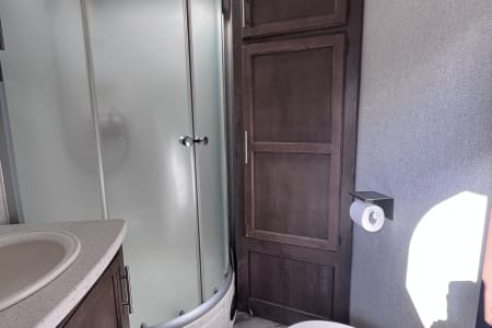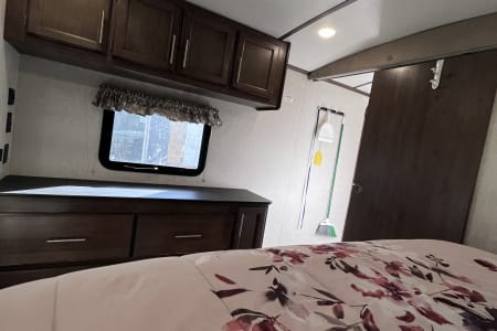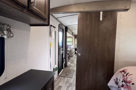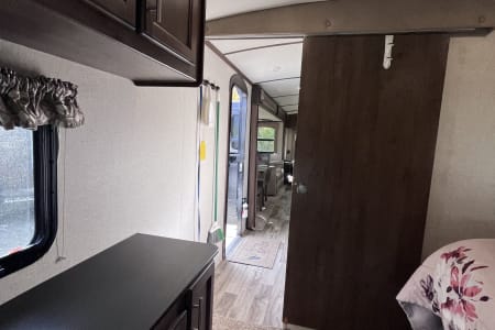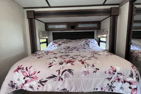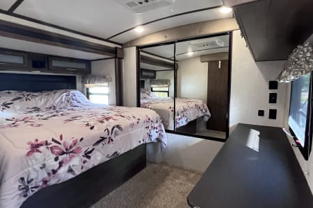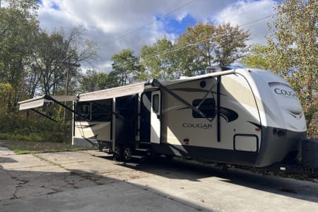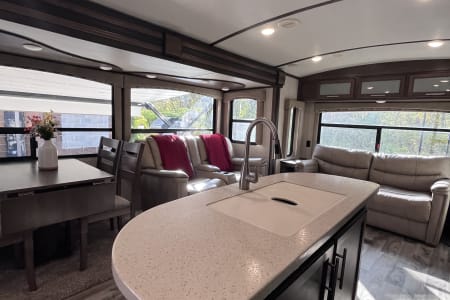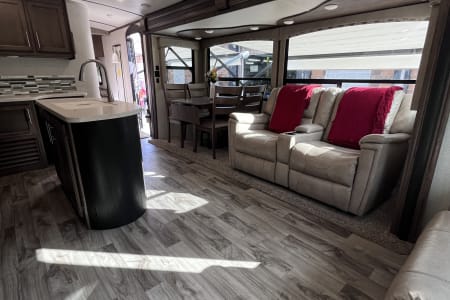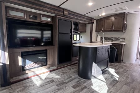 37 foot camper with 3 slides! Huge open living space. King bedroom with new upgraded mattress, large closet, bath with shower and linen closet, kitchen, dining table and chairs, island with sink, coffee nook, fold out sofa, dual recliners, fireplace, 50 in Smart TV. Two large awnings and outdoor speakers. We deliver for all rentals! We do not allow anyone to move the trailer. Pets are welcome.
