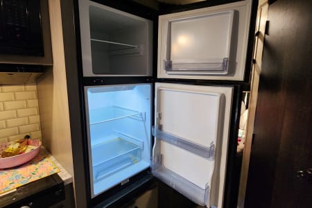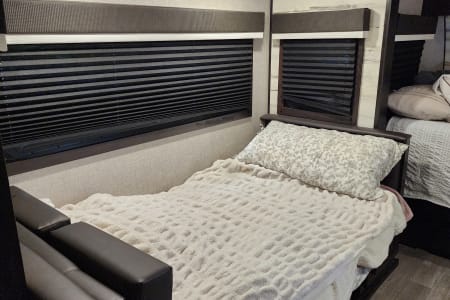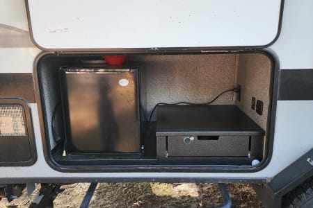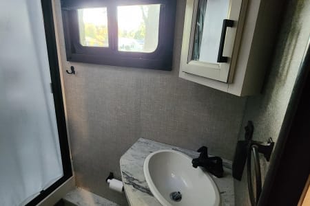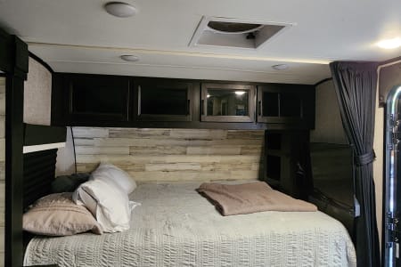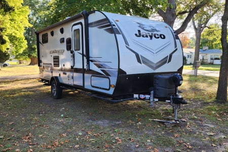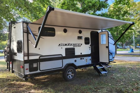 This travel trailer is a 2022 Jayco that is packed with all the modern amenities to make your camping trip a great experience. This trailer contains water, sewer and electric hook ups, indoor and outdoor shower, full bathroom, microwave, stove, fridge, freezer, sink, TV, radio, digital antenna, heat, A/C, sun awning and room for up to 6 adults. It also features an outdoor kitchen and mini fridge. There is a solar panel mounted on the roof for rustic camping.