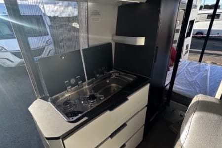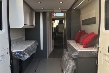 Le fourgon Maxi garage pour une fois en 5.99M, bénéficiez de 4 vrais couchage et d'un vrai garage arrière grâce a son lit réglable en hauteur électriquement.