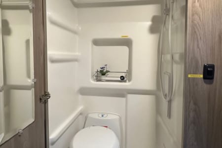 Home on Wheels: Experience the comfort of home while you travel with a full bathroom (shower & toilet), hot water, and a heating system to keep you cozy. A high-performance MaxxAir ceiling fan ensures you stay cool during warmer months.